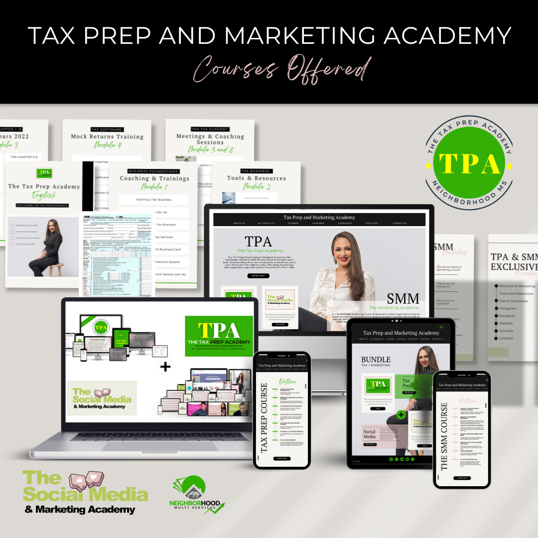 You will learn how to successfully start, register and create your business brand. You will learn individual 1040 tax returns and self-employment returns. Some of the training includes ethics, tax preparer security, compiling taxpayers’ information, filing status, dependents, and deductions, interest and dividends, social media marketing, how to chose the right platform for your business, how to get clients with digital marketing, and much more.