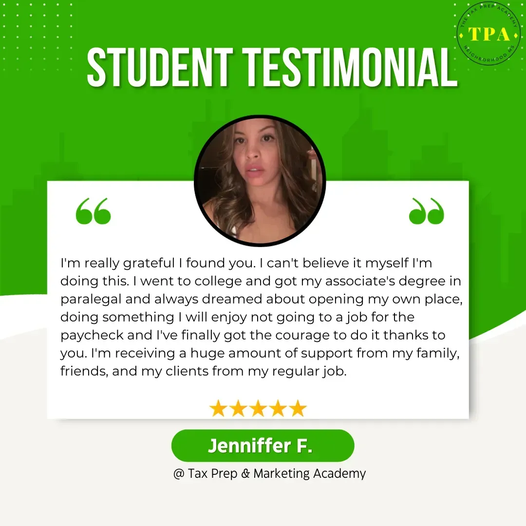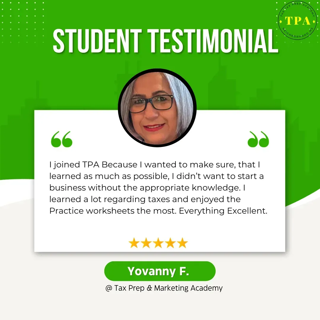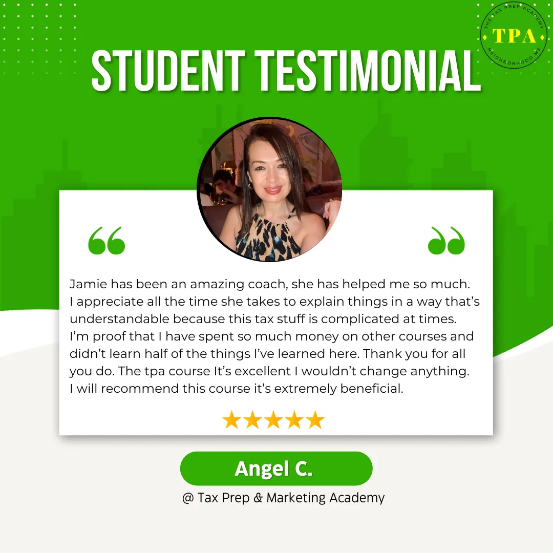 I signed up for TPA because I wanted to start my own tax business. My experience with the classes was excellent, they explain everything in a way that is impossible not to understand. I loved everything about the course, the coaching, support, and classes. I highly recommend it, it's an excellent course.