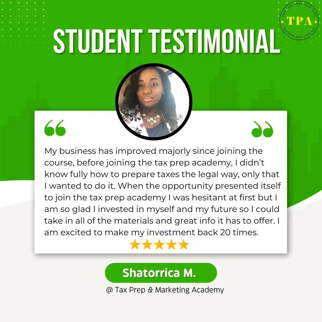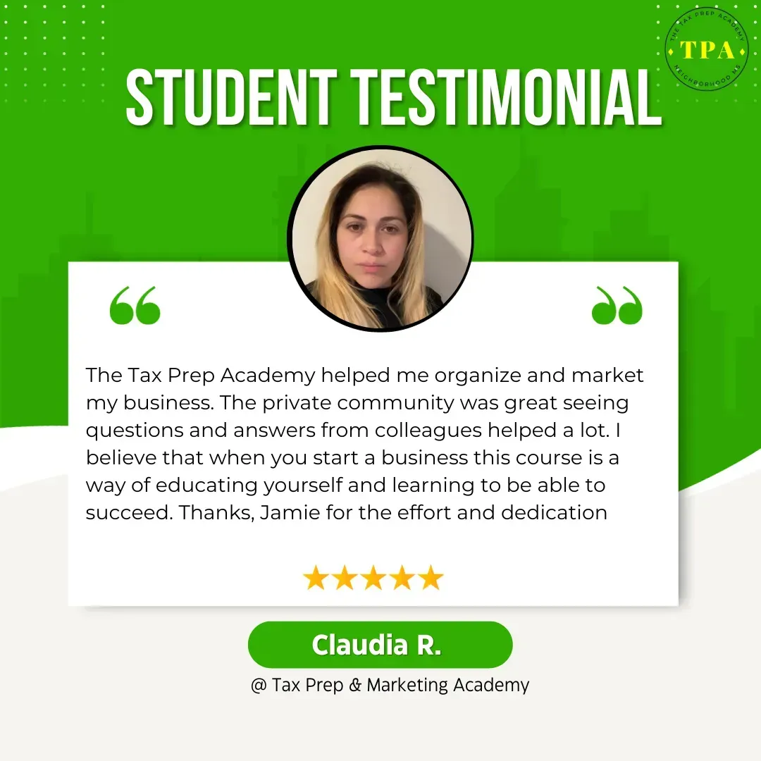 Before joining the Tax Prep Academy I did not offer tax services and had very little knowledge about tax law. After joining the Academy, I am more knowledgeable in the tax area and my services have expanded to a bigger public. I will say that the investment is worth it. You will help get and support through the whole process and not only get knowledge about tax law but also about marketing your business. Jamie is amazing, great communication. She is always willing to help.