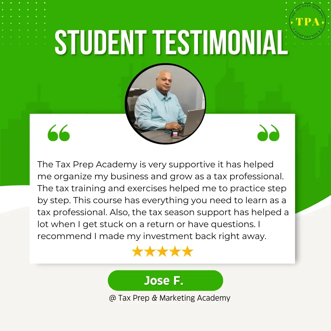 We stand by the comprehensive nature of our program, confident that it will not only teach you about taxes but also guide you in establishing your own tax business. The resources provided are a culmination of endless hours, significant investment, and dedicated effort. We have received glowing testimonials from past participants who have successfully doubled their investment after completing the course. Additionally, it's worth noting that enrolling in this course can be considered a tax-deductible expense for your tax business.